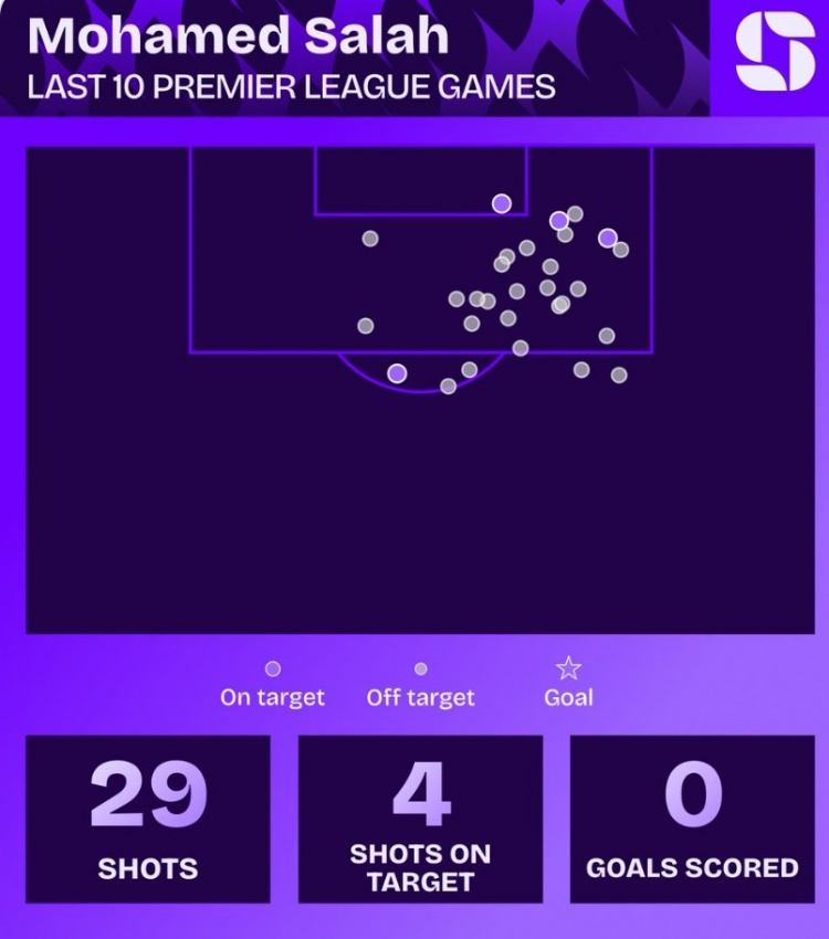 3月3日讯 Squawka统计了萨拉赫近10场英超比赛的数据,这位利物浦前锋射门29次,进球挂零。
